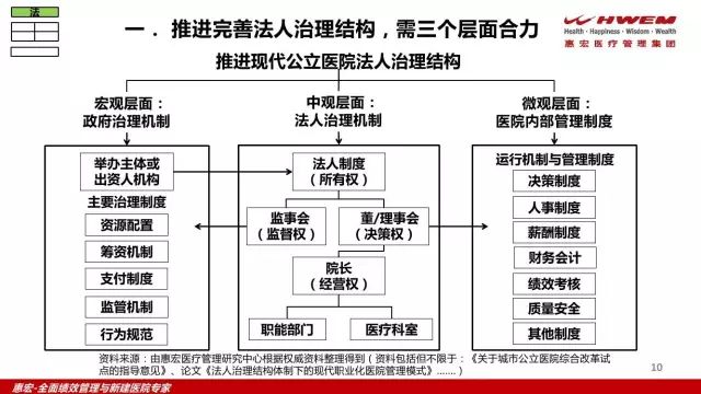 引语:定位法人治理结构为全面绩效的制度先导,惠宏医疗管理集团在业界率先进行的现代医院管理制度“六大要素”解构为因时因势的全面总结。 文/本 中国医院院长杂志记者黄柳 当医院运营与战略、人力资源、收入分配“融”于绩效管理的时代来临,建立一套因时因势、行之有效的绩效体系成为了医院管理者们的共识。但与此同时需要更加重视的是,从设计完善到落地,绩效体系持续发力还有赖于科学的医院治理结构、现代医院管理制度的支撑与“护航”