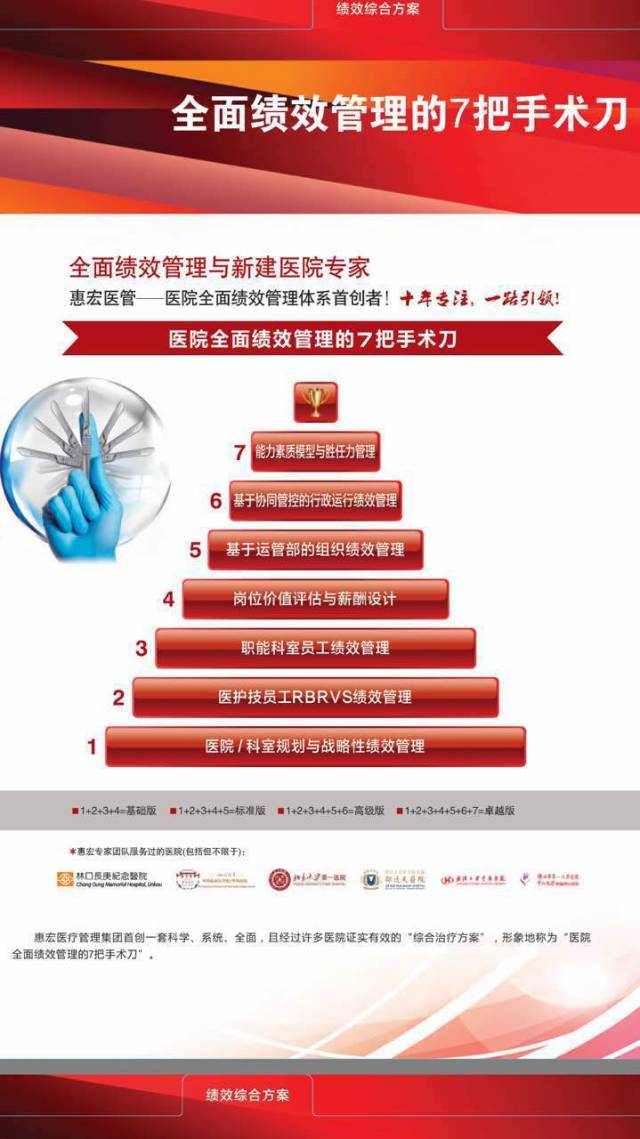 惠宏医疗管理集团为医院提供全面绩效管理与新建医院方面的咨询和培训服务,另外还有医院科室规划、医院组织架构、医院定岗定编和医院胜任力等业务