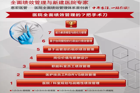 惠宏医疗管理集团为医院提供全面绩效管理与新建医院方面的咨询和培训服务,另外还有医院科室规划、医院组织架构、医院定岗定编和医院胜任力等业务